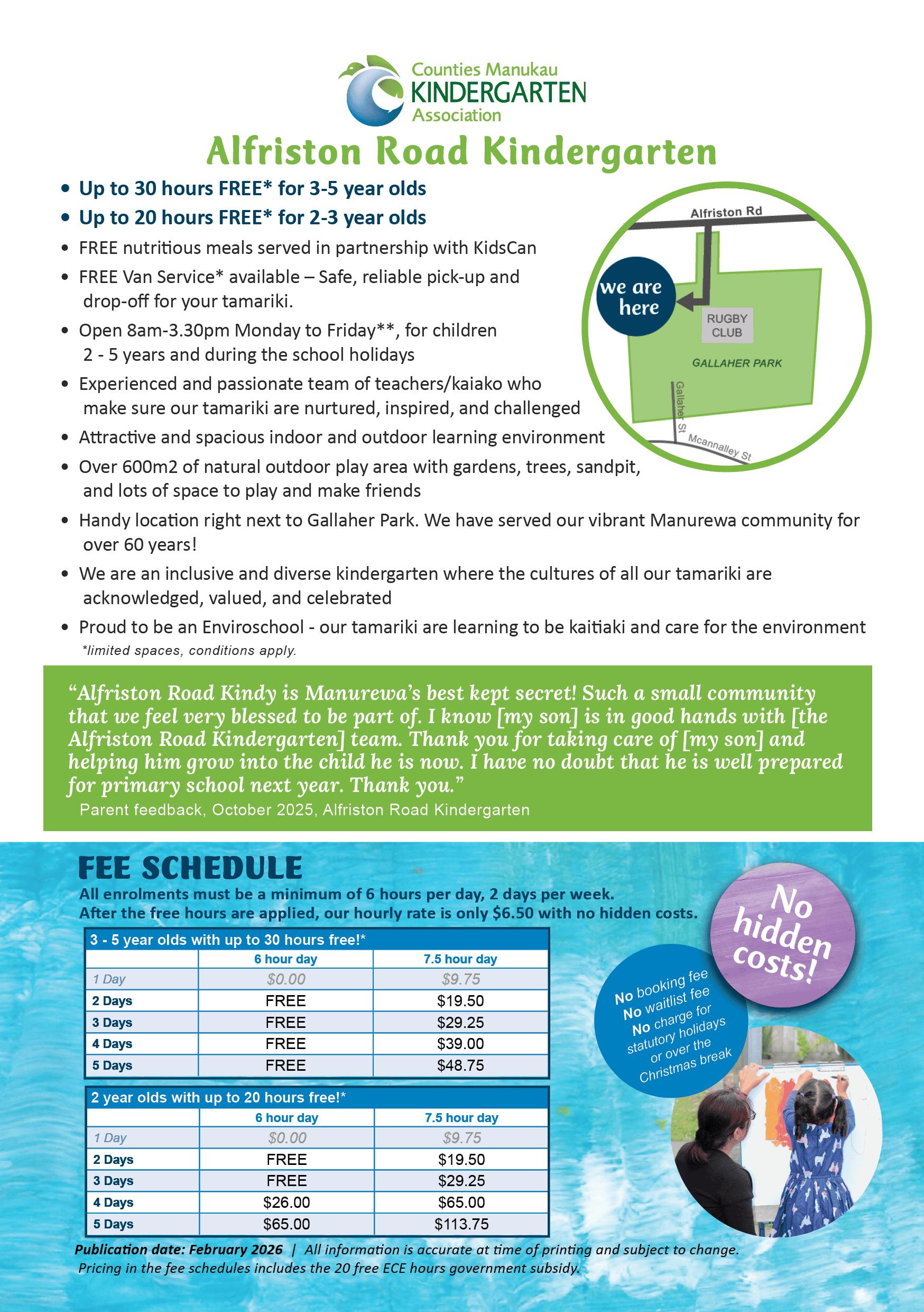 Alfriston Road Kindergarten, tucked into a quiet corner of Gallaher Park, serves an area covering central and eastern Manurewa, Randwick Park, The Gardens and semi-rural Alfriston.